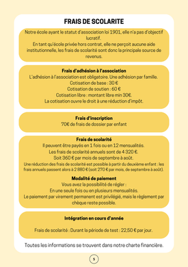 Le montant des frais de scolarité est fixé à 360 Euros par mois par élève, sur une base de douze mois. Une réduction est possible à partir du 2ème enfant d'une fratrie, le montant de l'inscription passant à 270 EUROS pour ce deuxième enfant inscrit.